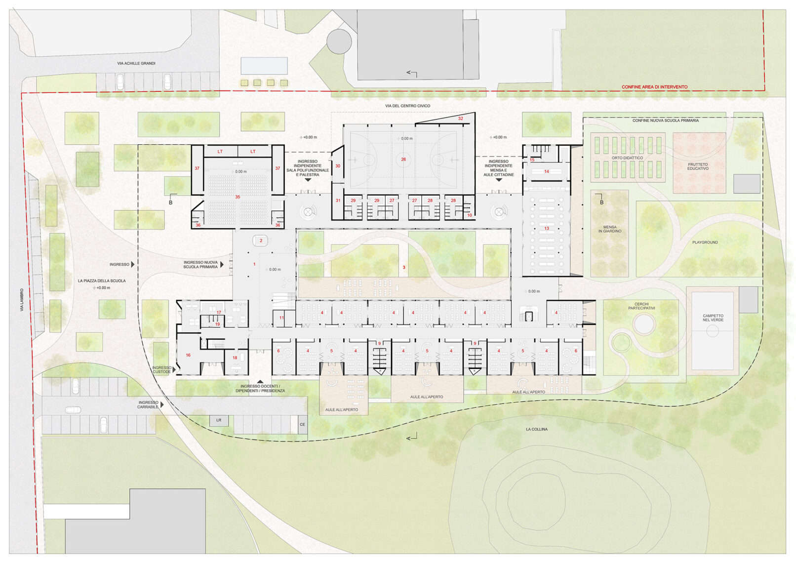 The result is a garden school, where open spaces are not only functional to recreation, but are configured as specific places for learning, in accordance with a conception of teaching oriented towards environmental sustainability, attention to nature and outdoor learning.