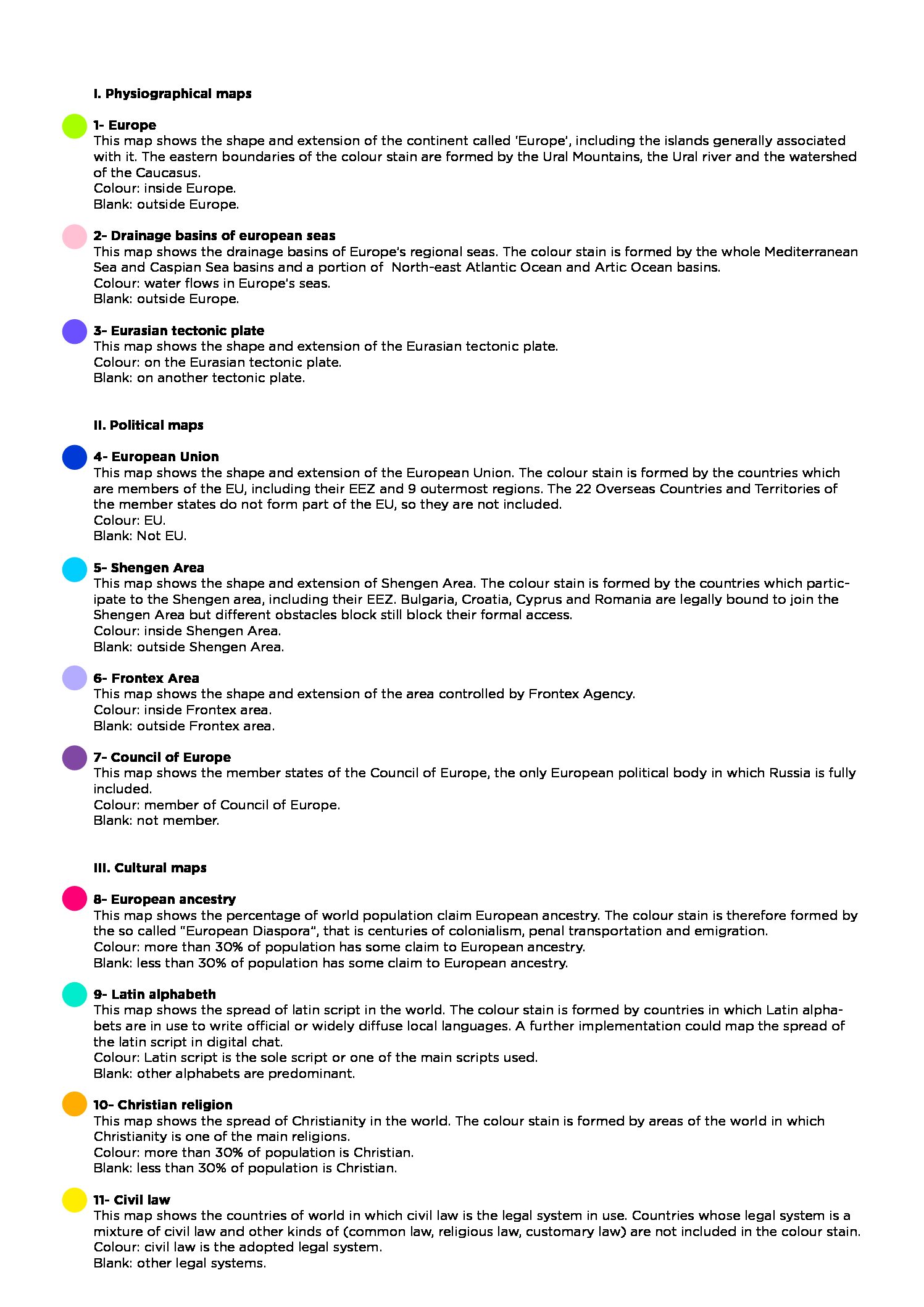 Combining cartography and visual arts, wimbe searches for Europe in a series of alternative maps. It is an open project and under development: so far, it offers 11 transparencies depicting physiographic, political and cultural interpretations of Europe. The base projection is a Winkle Triple.