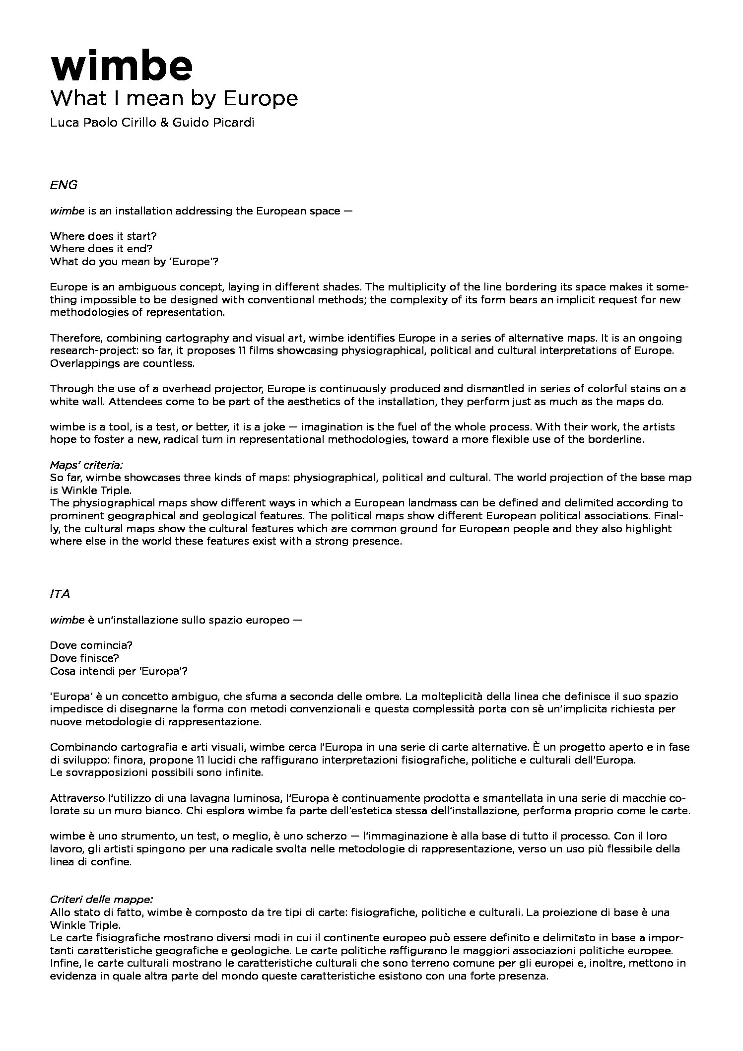 The possible overlaps are infinite. Through the use of an overhead projector, Europe is continuously produced and dismantled in a series of colored spots on a white wall. Those who explore wimbe are part of the very aesthetic of the installation, they perform just like the maps do.