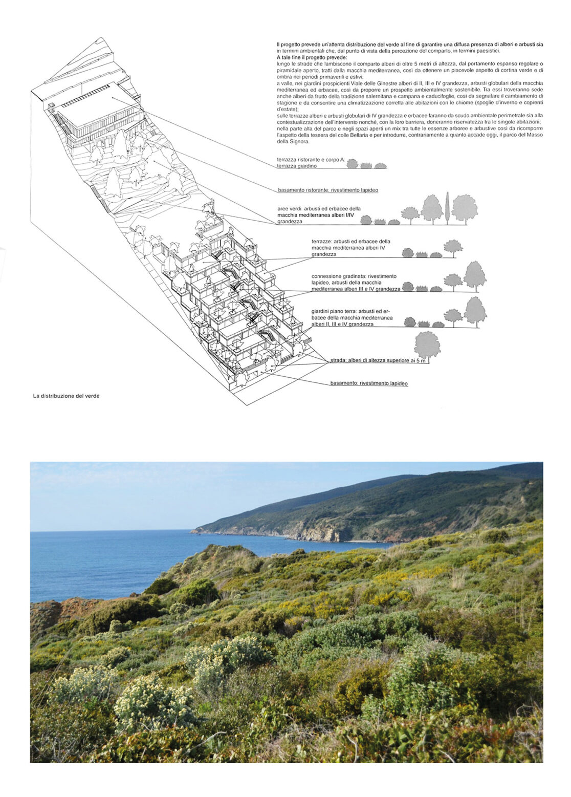 For this reason, we selected botanical species typical of Campania coast, shrubs and ground cover plants such as holm oaks, strawberry trees, olive trees, laurel, rosemary, thyme, broom, santolina, armeria maritima.
